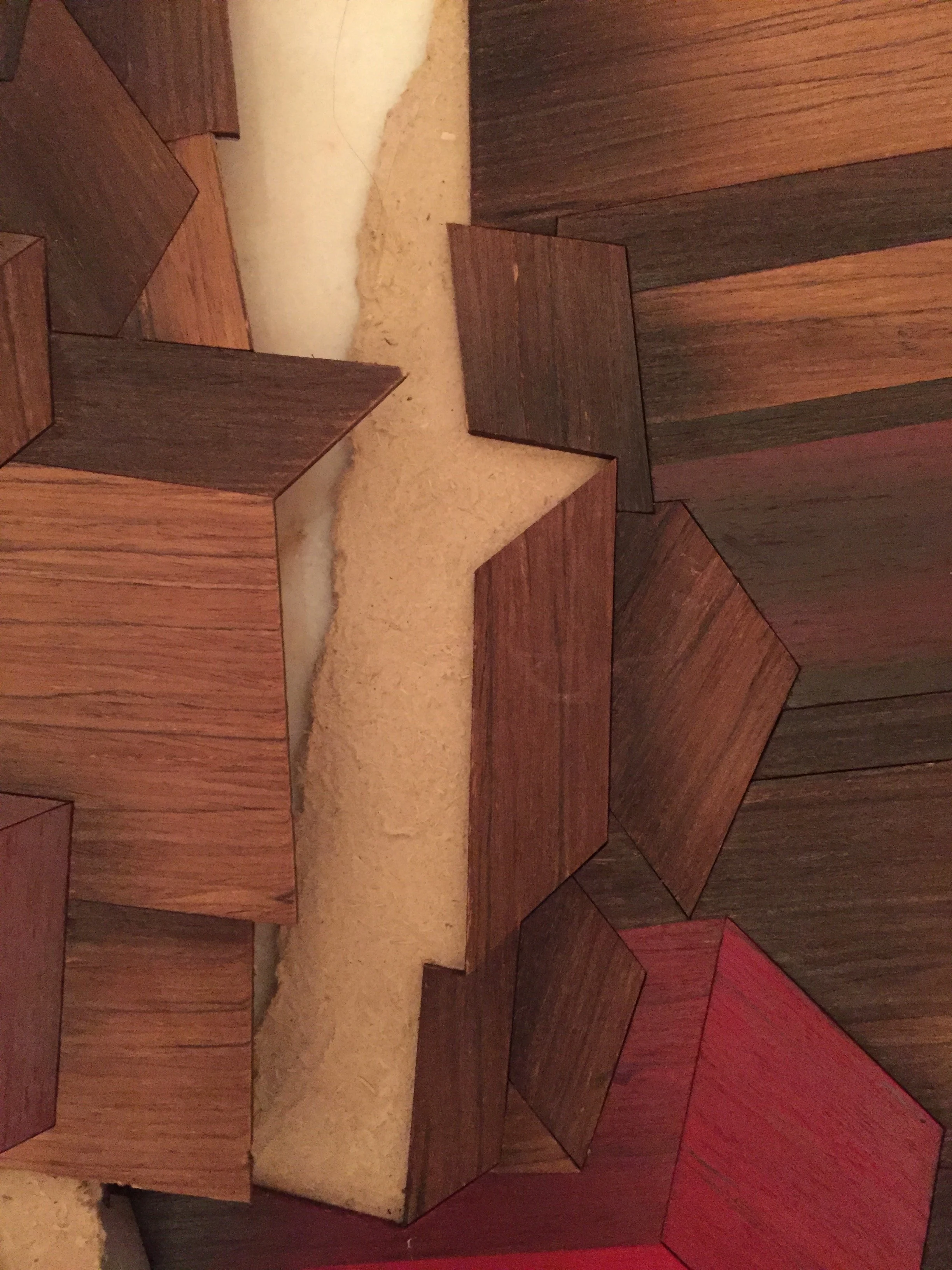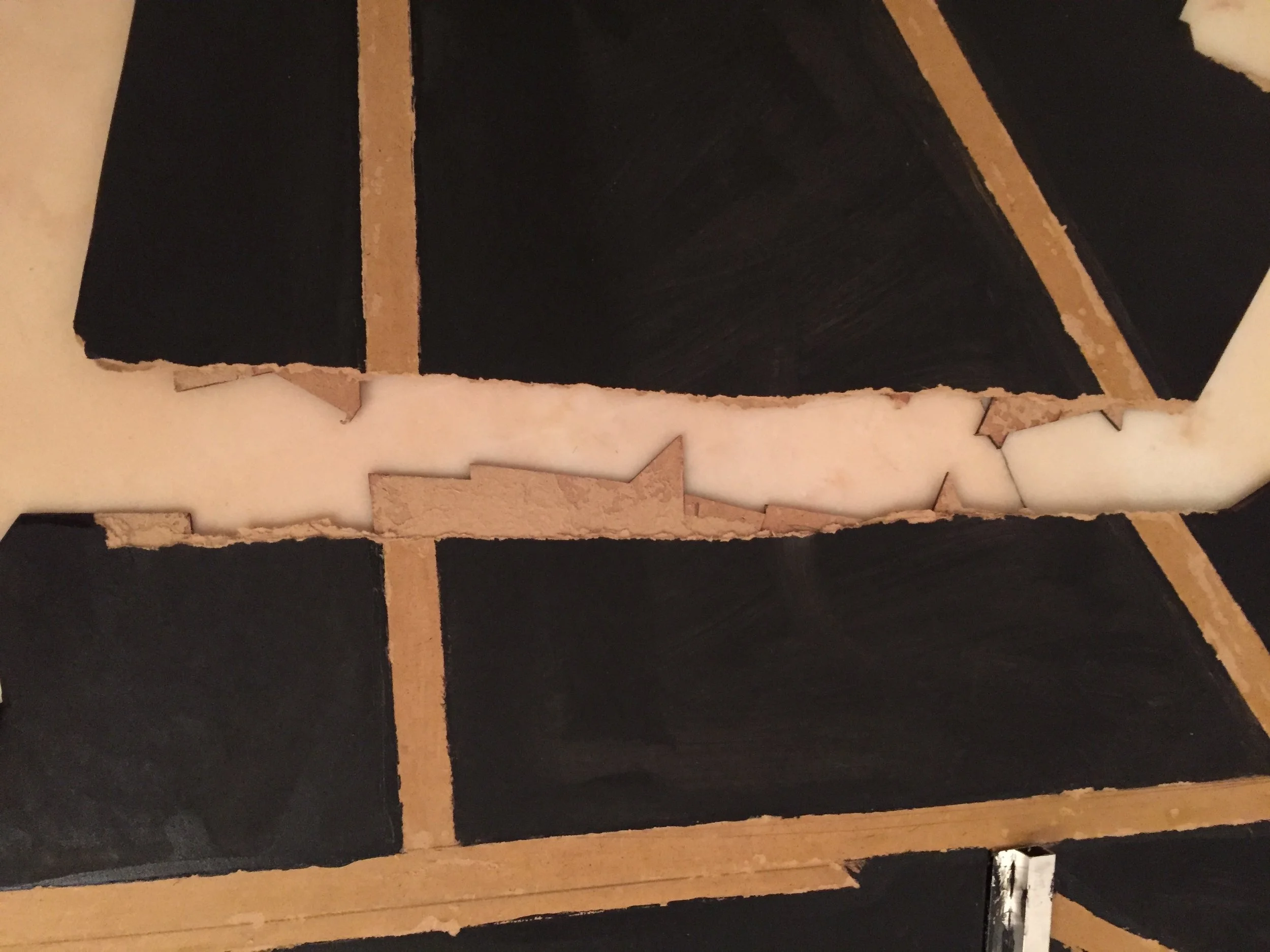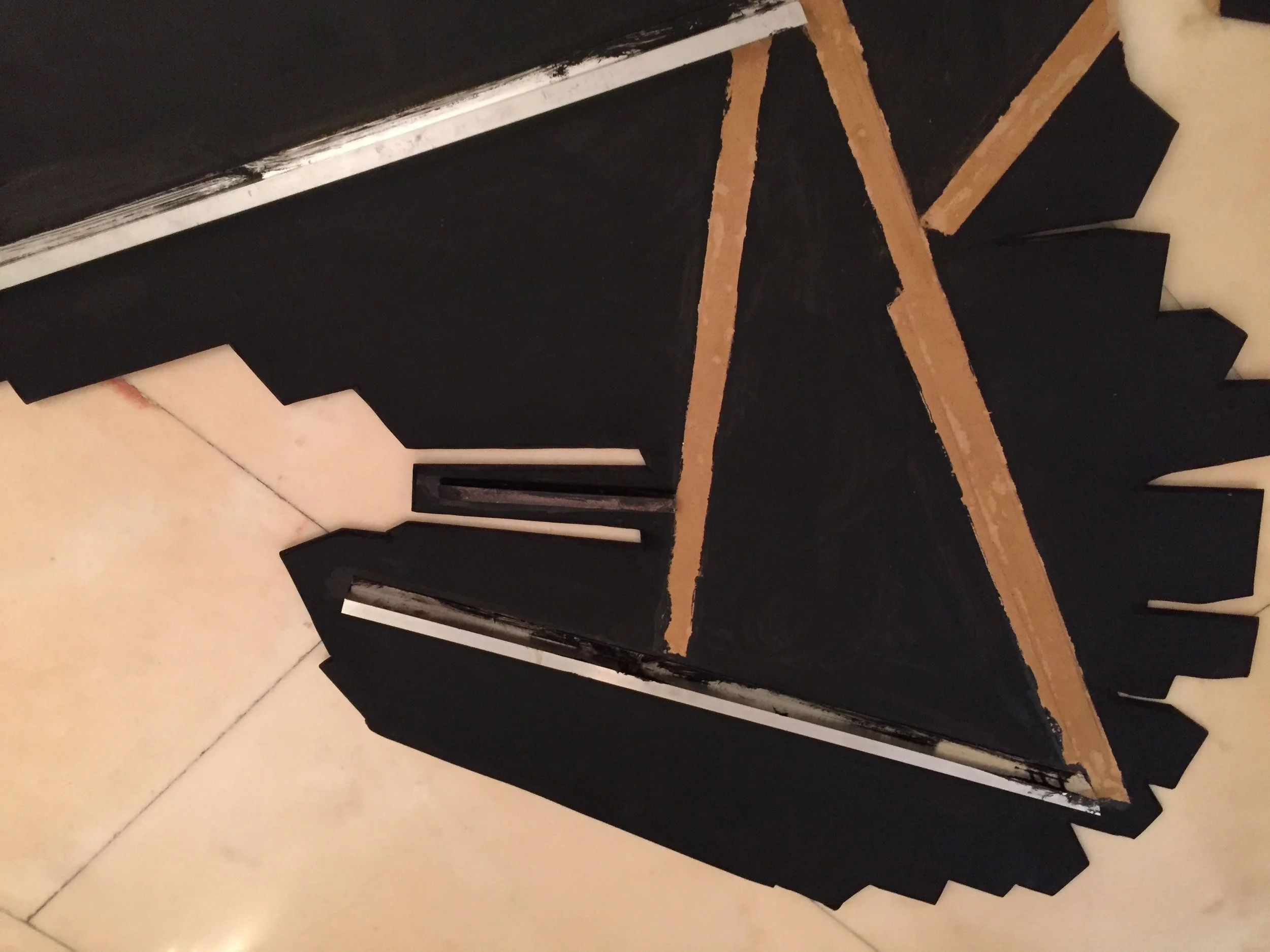 This artwork, belonging to a private collector in Paris, sustained severe structural damage during transport. The artwork was broken into two separate sections as a result of impact. The work consisted of compressed cardboard reinforced on the reverse with metal bar supports — elements that had themselves been displaced and deformed by the accident. The conservation strategy was developed reassembling the fractured structure and aligning from the front-facing surface to ensure perfect correspondence of levels and planes. Appropriate conservation adhesives were used in combination with specially adapted clamping systems designed to distribute pressure evenly without causing further stress.