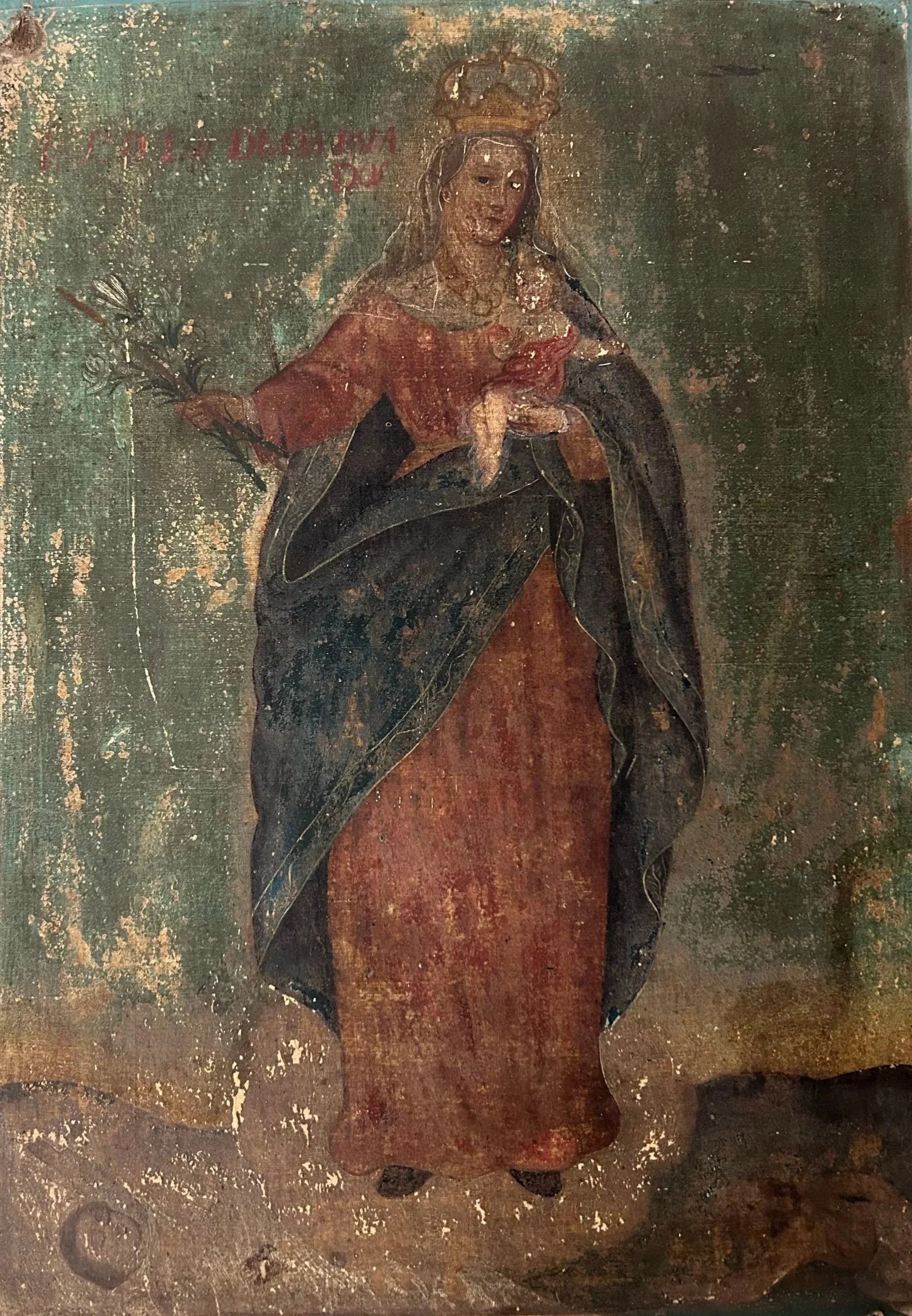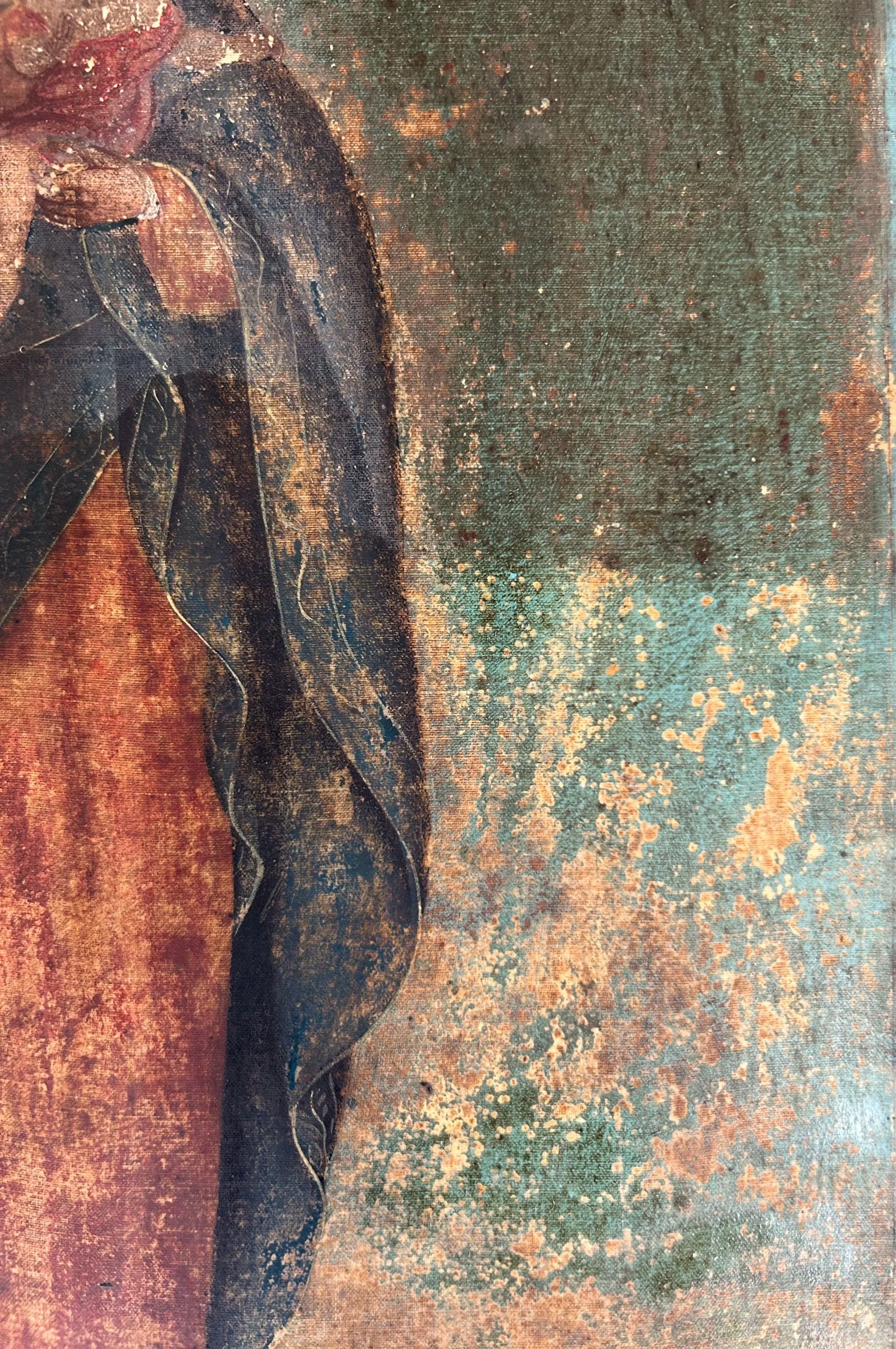 An archaeological approach to conservation was adopted, privileging the preservation of the work’s historical stratigraphy. Treatment focused on stabilizing the remaining original material and carefully reducing surface accretions, allowing the image to regain legibility while retaining the visible traces of its age and devotional history.