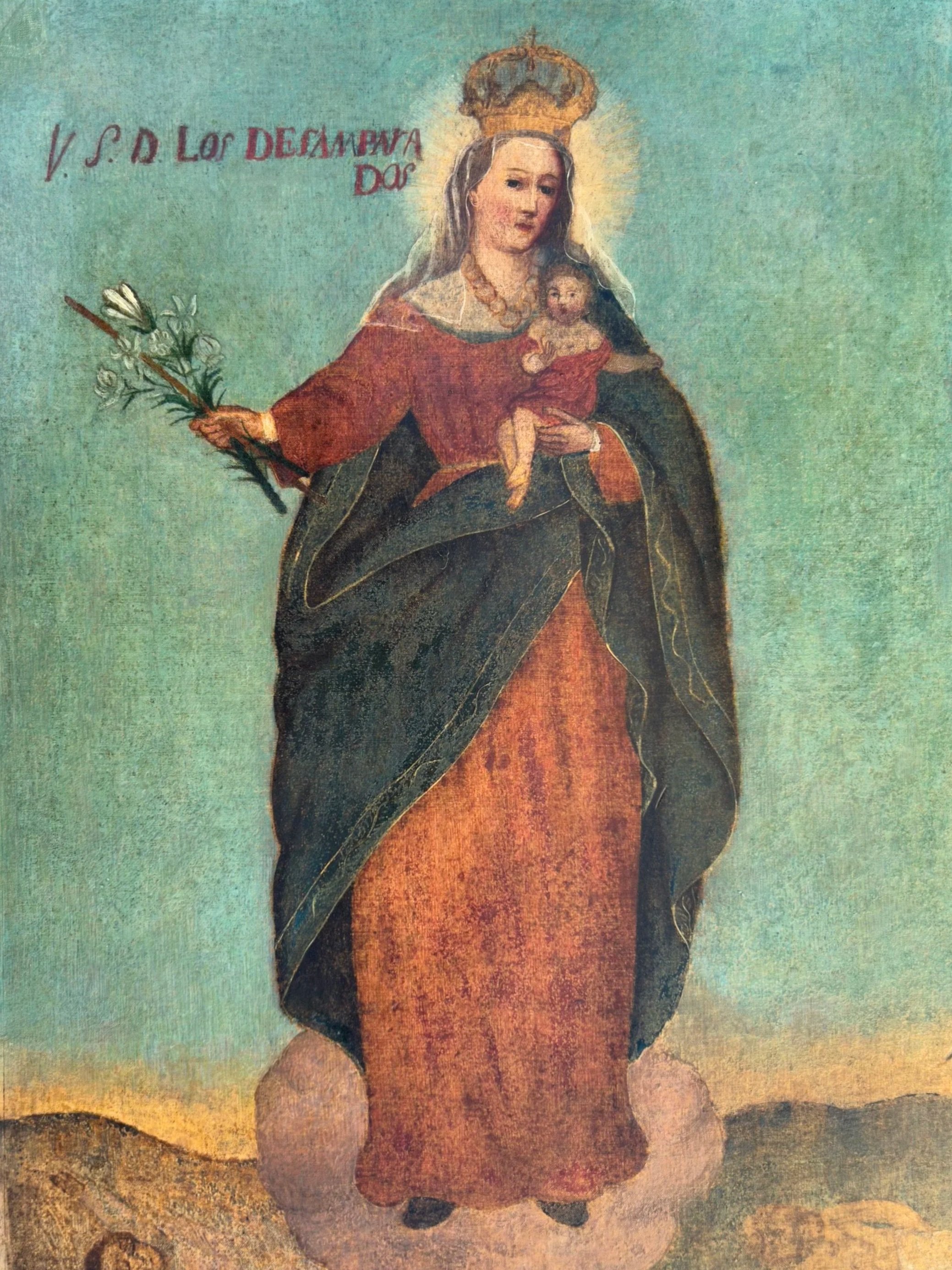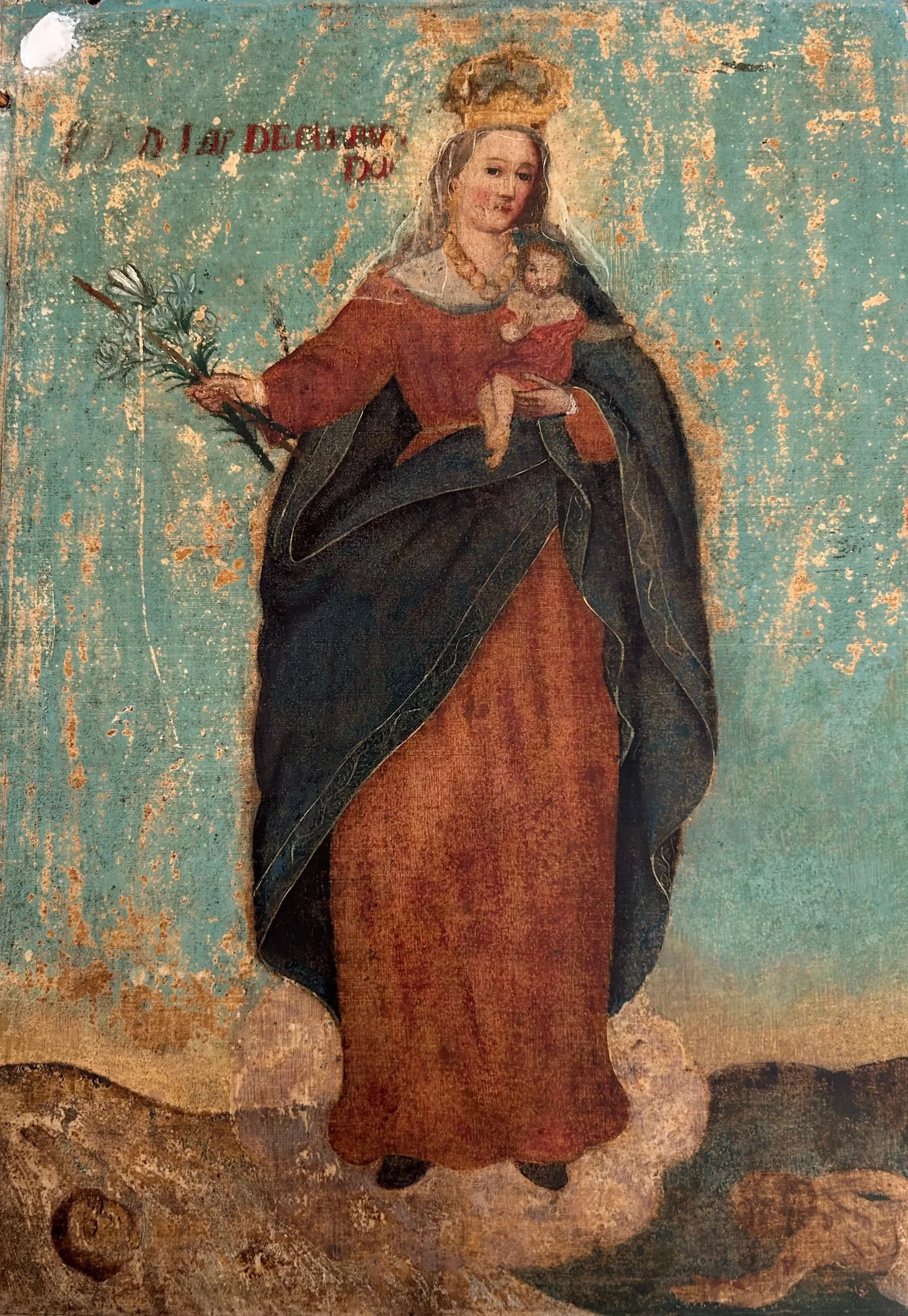 Nuestra Señora de los Desamparados (Our Lady of the Forsaken), a Colonial painting dating from the 18th–19th century, reflects a devotional image deeply rooted in Spanish tradition. The subject, venerated as the patron saint of Valencia, has been widely represented since the 15th century, particularly in Iberian and colonial contexts, where such images functioned as intimate objects of personal devotion.