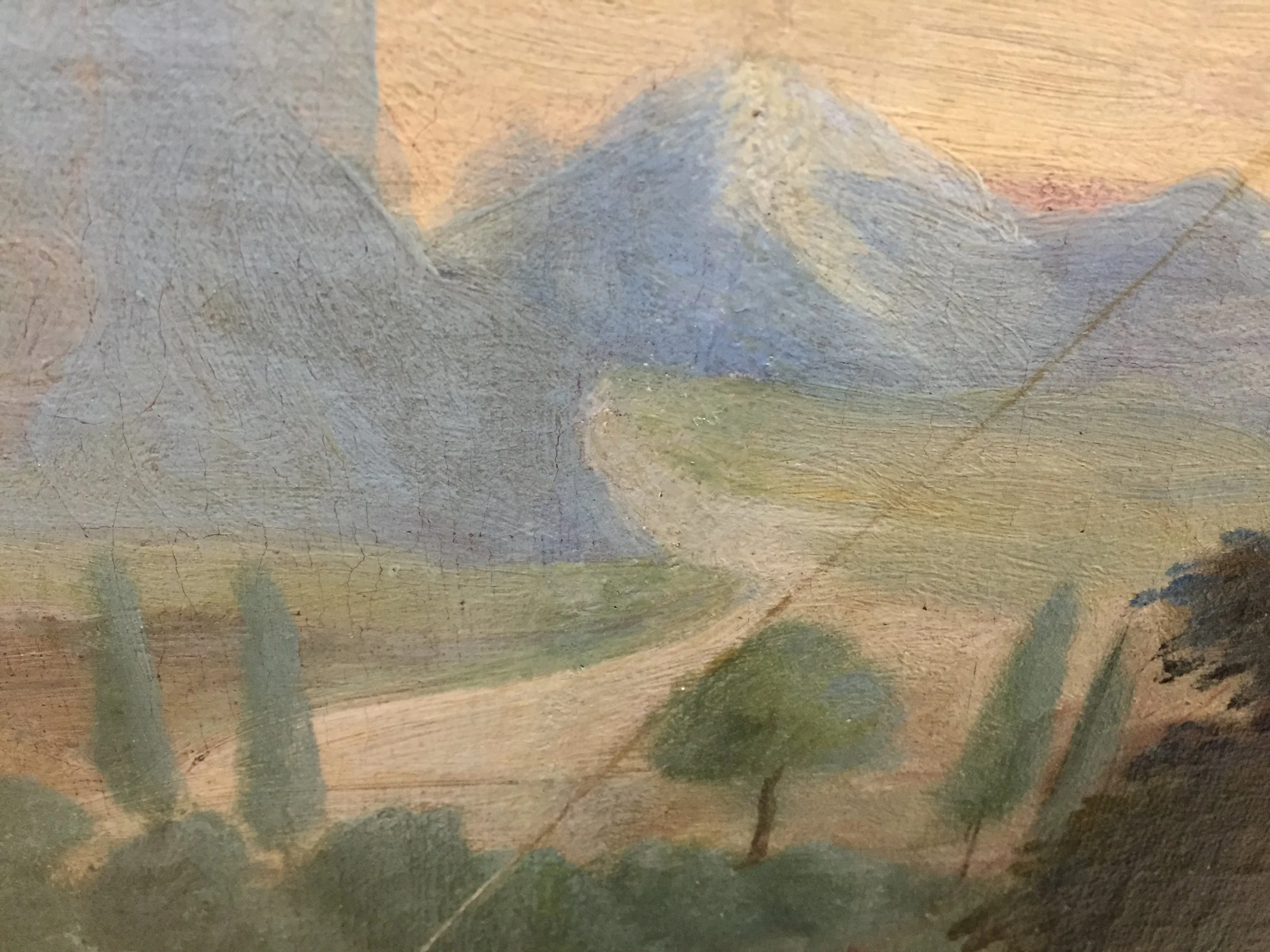 The painting’s architectural placement — fixed within a wall setting with a permanent perimeter frame — would not easily allow future routine tension adjustments once reinstalled. A lining treatment was required to stabilize the original canvas. The pictorial layer underwent a controlled surface cleaning, reduction of oxidized varnish, filling of losses a chromatic reintegration and an application of a new protective varnish.