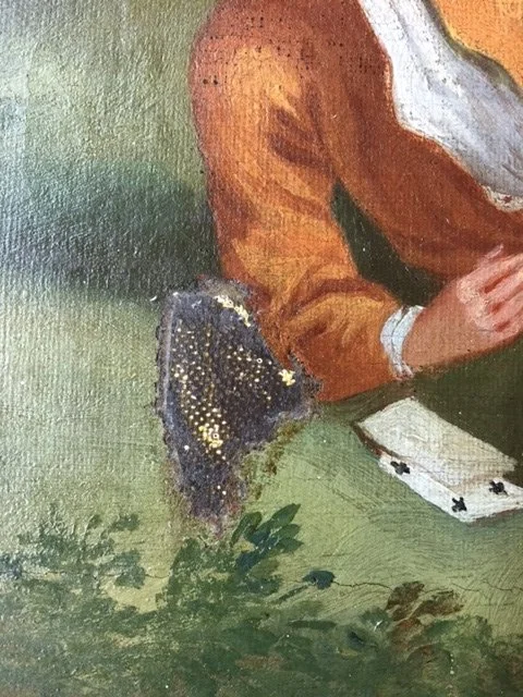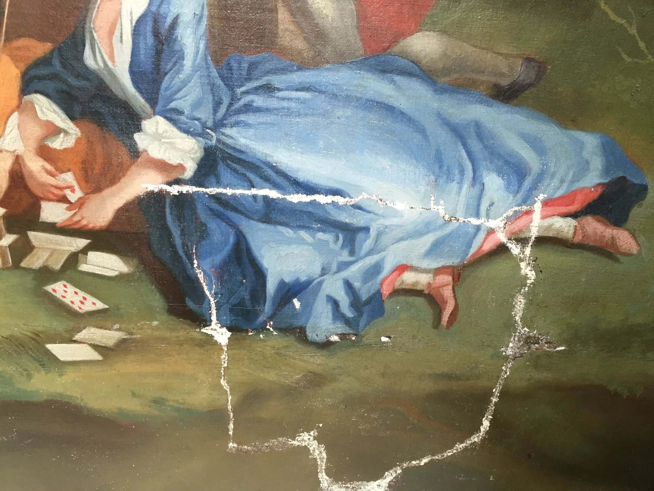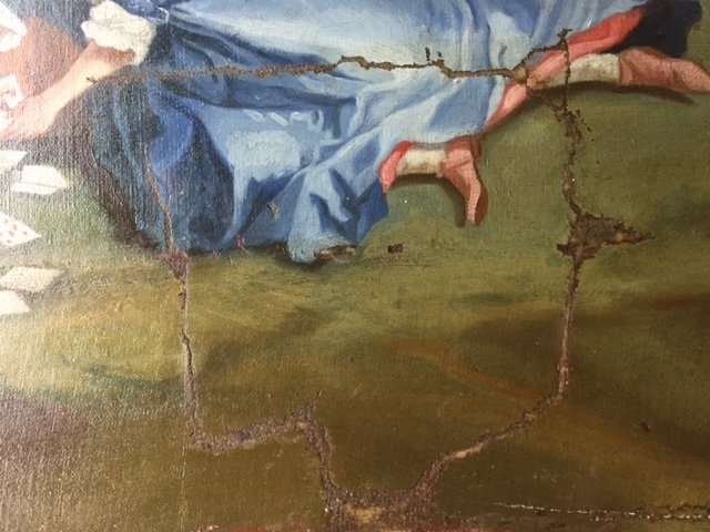 The work presented a large mechanical tear in the canvas support, forming an “L” shape and extending across a significant portion of the composition and surface deposits and oxidation of the existing protective varnish.